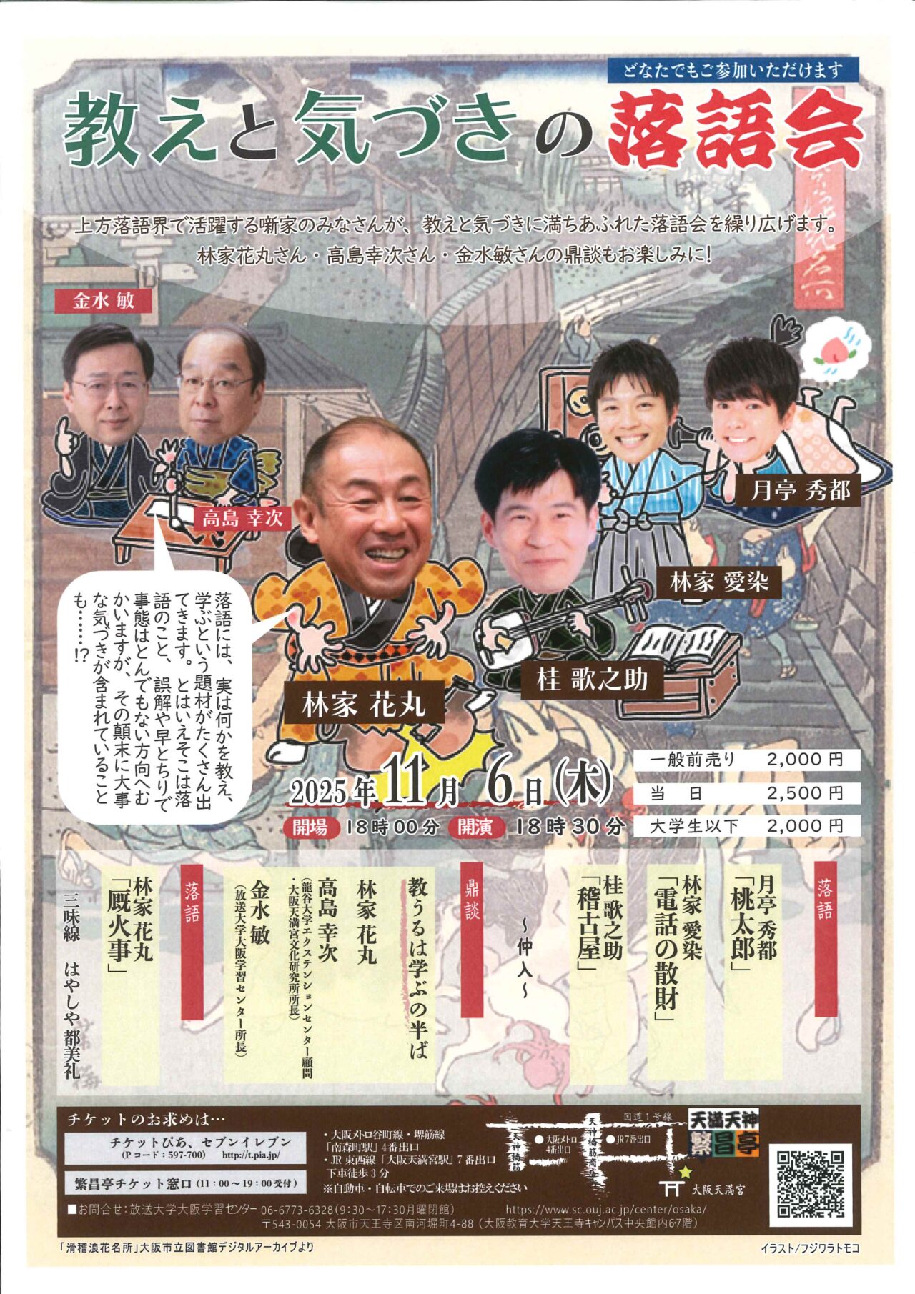 月亭秀都「桃太郎」/林家愛染「電話の散財」/桂歌之助「稽古屋」~仲入~【鼎談】「教うるは学ぶの半ば」林家花丸・高島幸次(龍谷大学エクステンションセンター顧問・大阪天満宮文化研究所所長)・金水敏(放送大学学習センター所長)/林家花丸「厩火事」