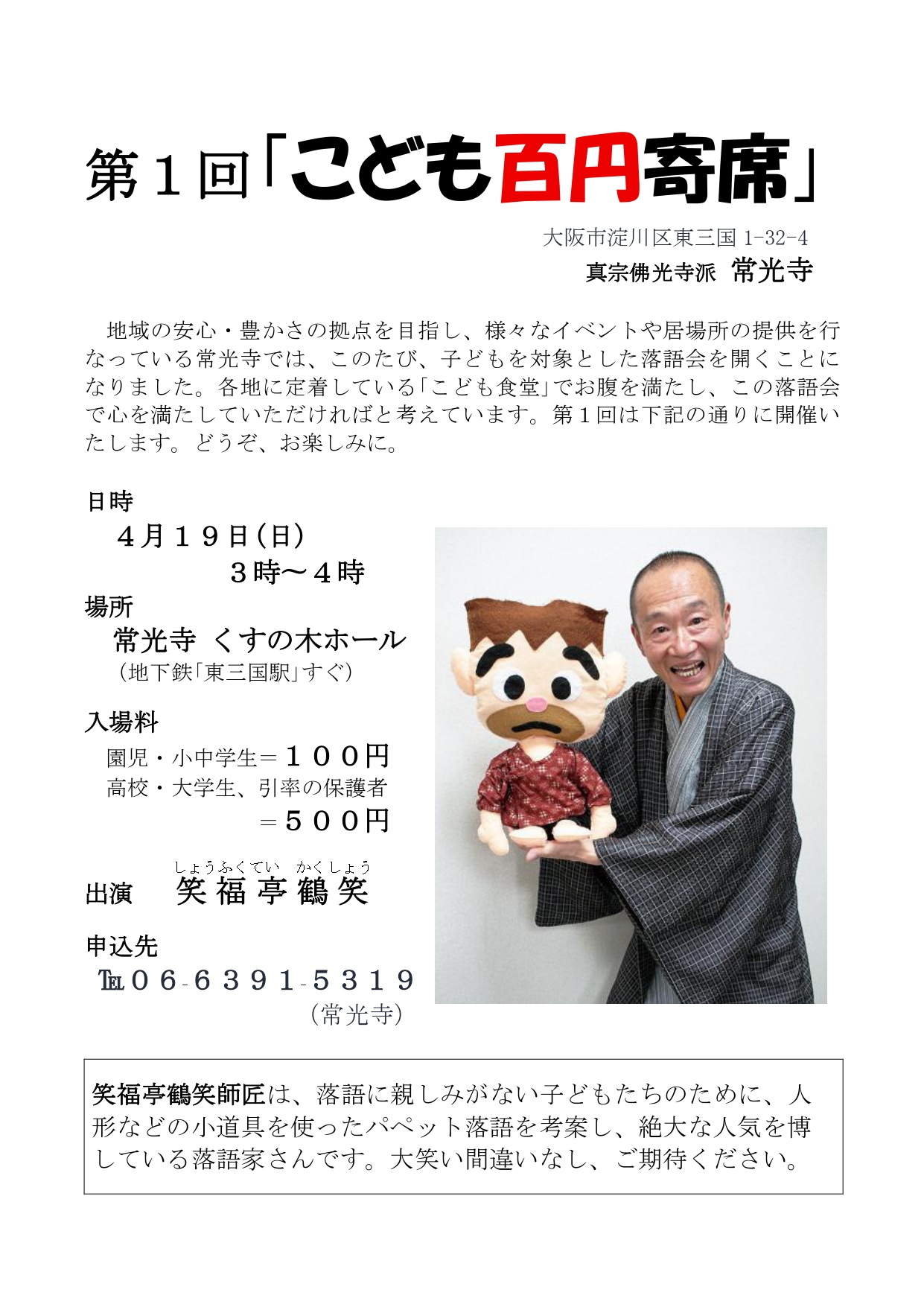 東三国の常光寺は、これまでの様々なイベントを企画し、地域に「居場所」を提供したり、近辺の「こども食堂」も応援したりされています。そこで新たに「こどものための落語会」を企画しました。当初は無料招待のつもりでしたが、やはりプロの芸に敬意をもってもらうため、駄菓子一つ買うのを我慢して、100円を払ってもらうことにしました。学習塾に通うのもいいけれど、たまには大笑いしてもらえたら嬉しいです。