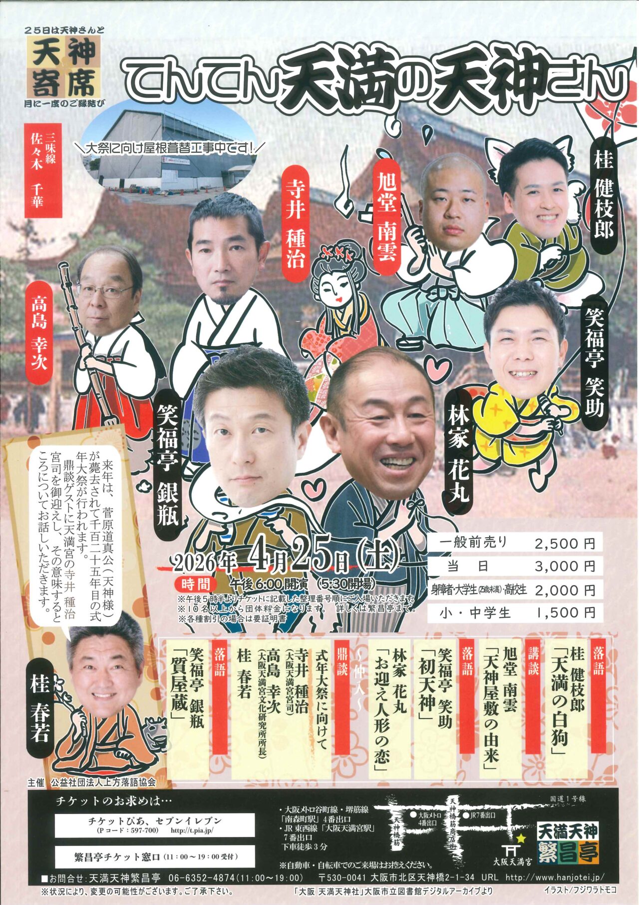 桂健枝郎「天満の白狗」/旭堂南雲「講談・天神屋敷の由来」/笑福亭笑助「初天神」/林家花丸「お迎え人形の恋」~仲入~【鼎談】「式年大祭にむけて」寺井種治(大阪天満宮宮司)・高島幸次(大阪天満宮文化研究所所長)・桂春若/笑福亭銀瓶「質屋蔵」